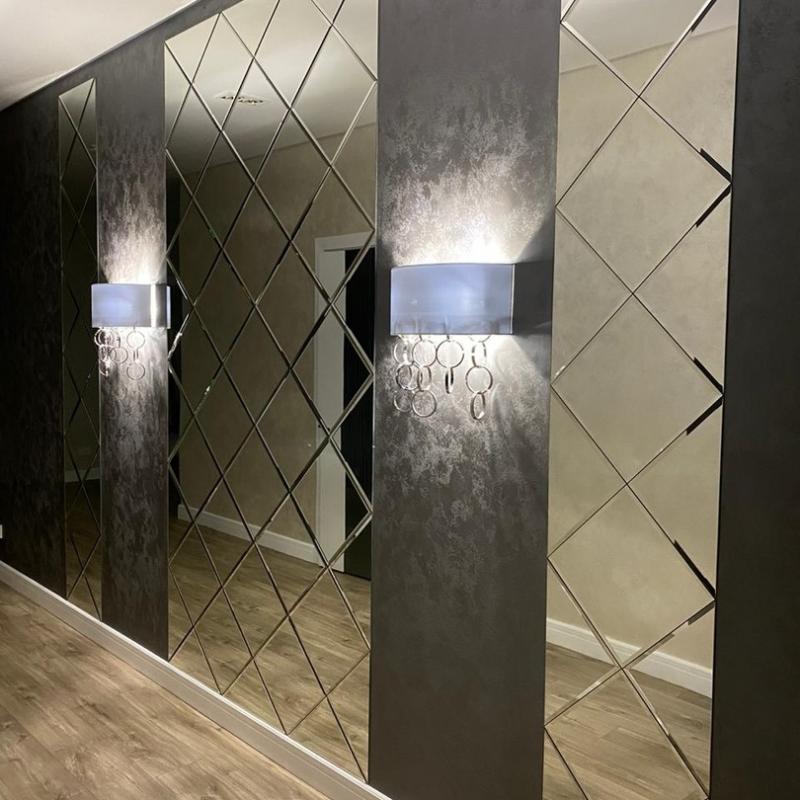 Использована зеркальная квадратная и треугольная плитка с фацетом.